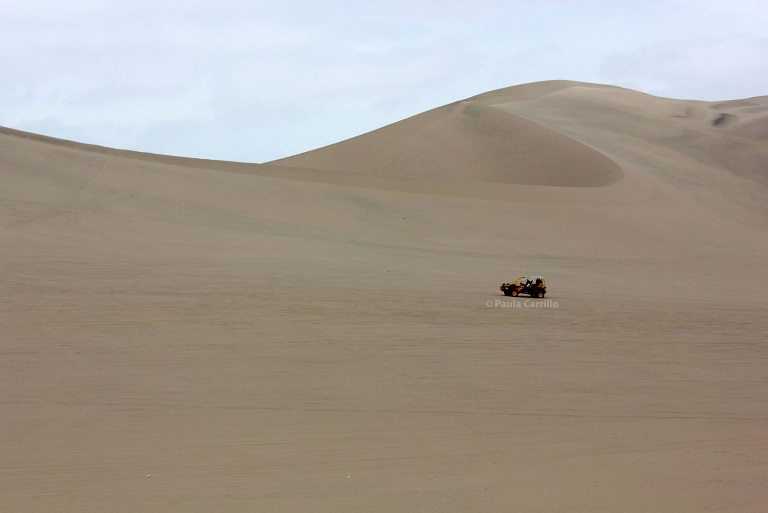 Ya en confianza, el conductor subía poco a poco las siguientes dunas, como cuando en una montaña rusa, el carrito se mueve lento para crear suspenso. Y ya arriba, y con el abismo justo al frente, el buggy aceleraba al máximo, incluso con una inclinación que se acercaba a los 80 grados. Con el corazón en la mano y la mirada del conductor buscando mi cara aterrorizada cada vez que venía una duna gigante, me arrepentí cien mil veces de haberme arriesgado. Pero era demasiado tarde y a pesar de todo, la vista era espectacular.